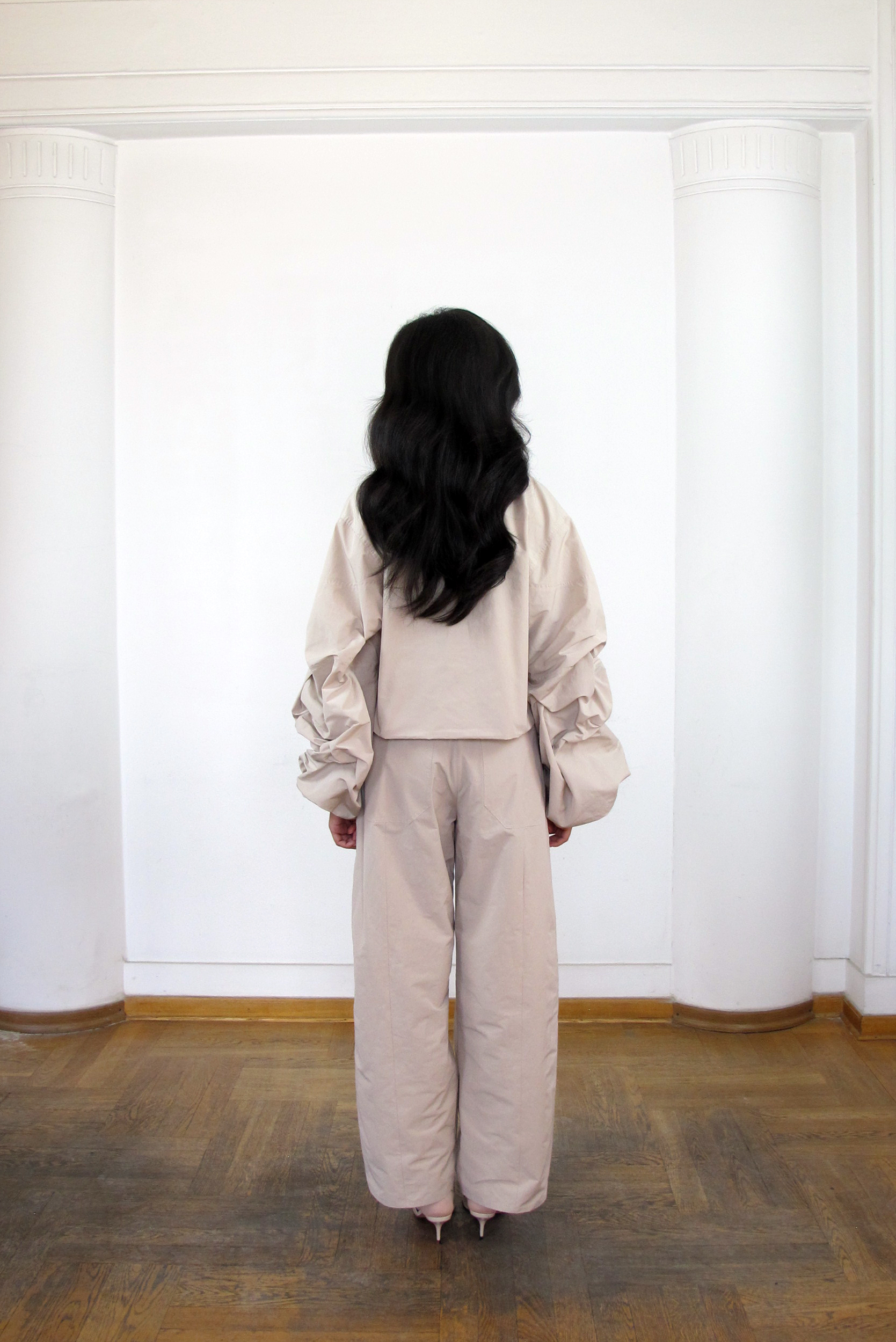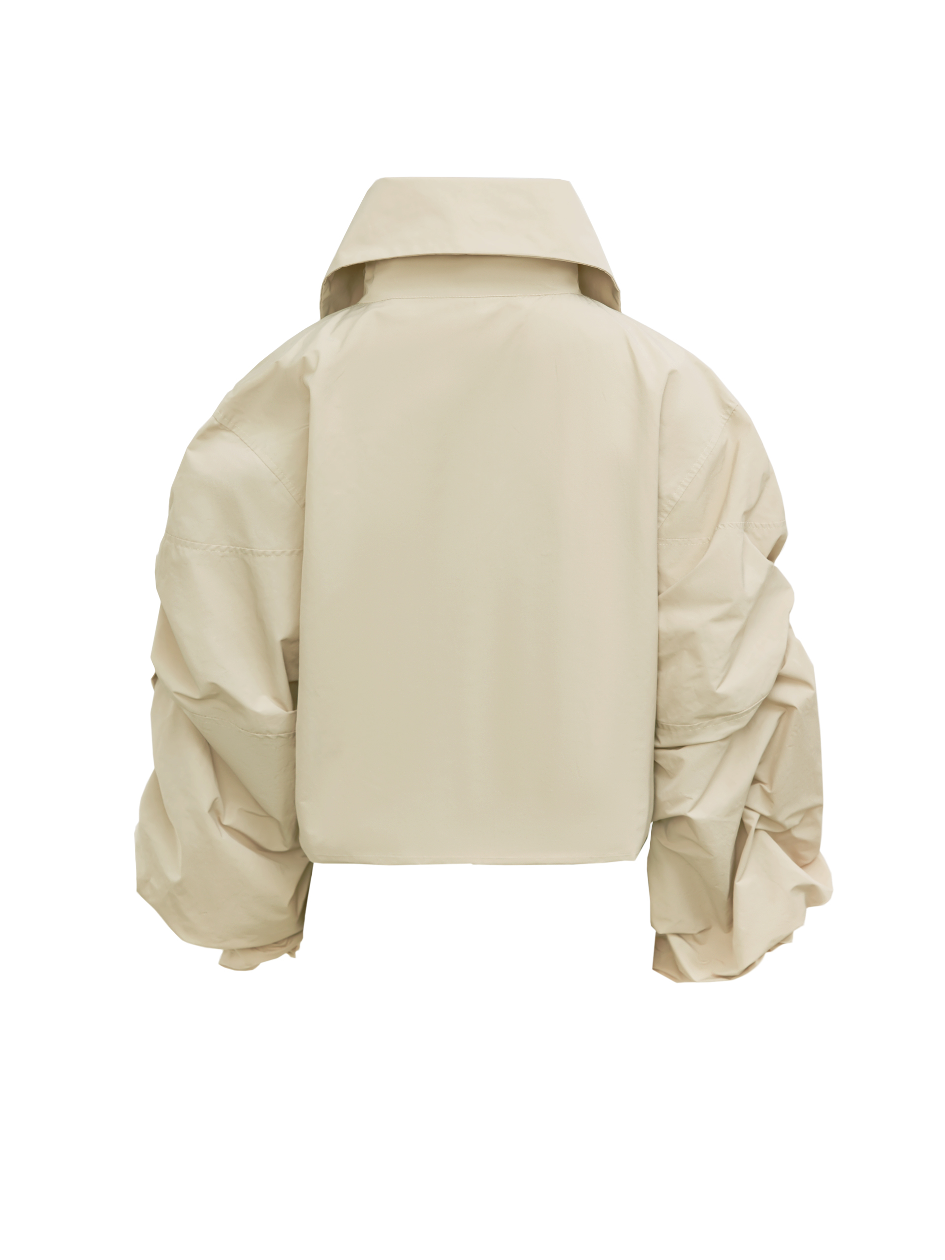 Pudełkowa kurtka z przerysowanymi rękawami ściągnietymi na gumie w mankiecie oraz na ramieniu. Dwie podwójne kieszenie z przodu otwarte z boku oraz z góry, dla wygody użytkowania. Wysoki kołnierz sprawdzi się w wietrzne dni.